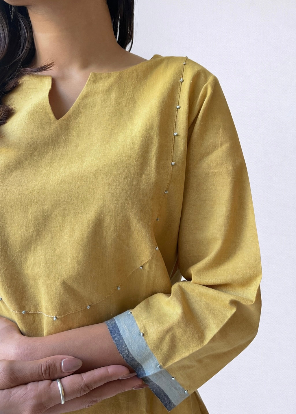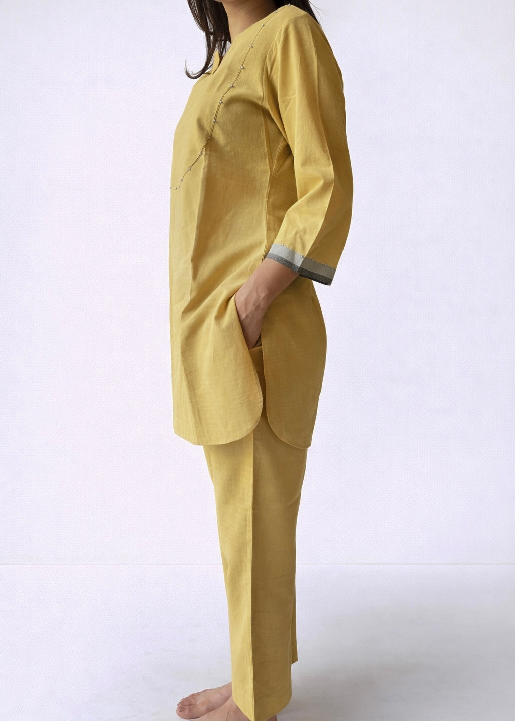 Long top paired with flat front pants, made using cotton handwoven fabric.