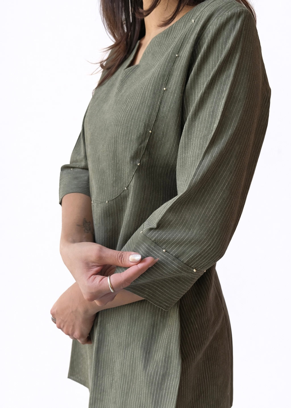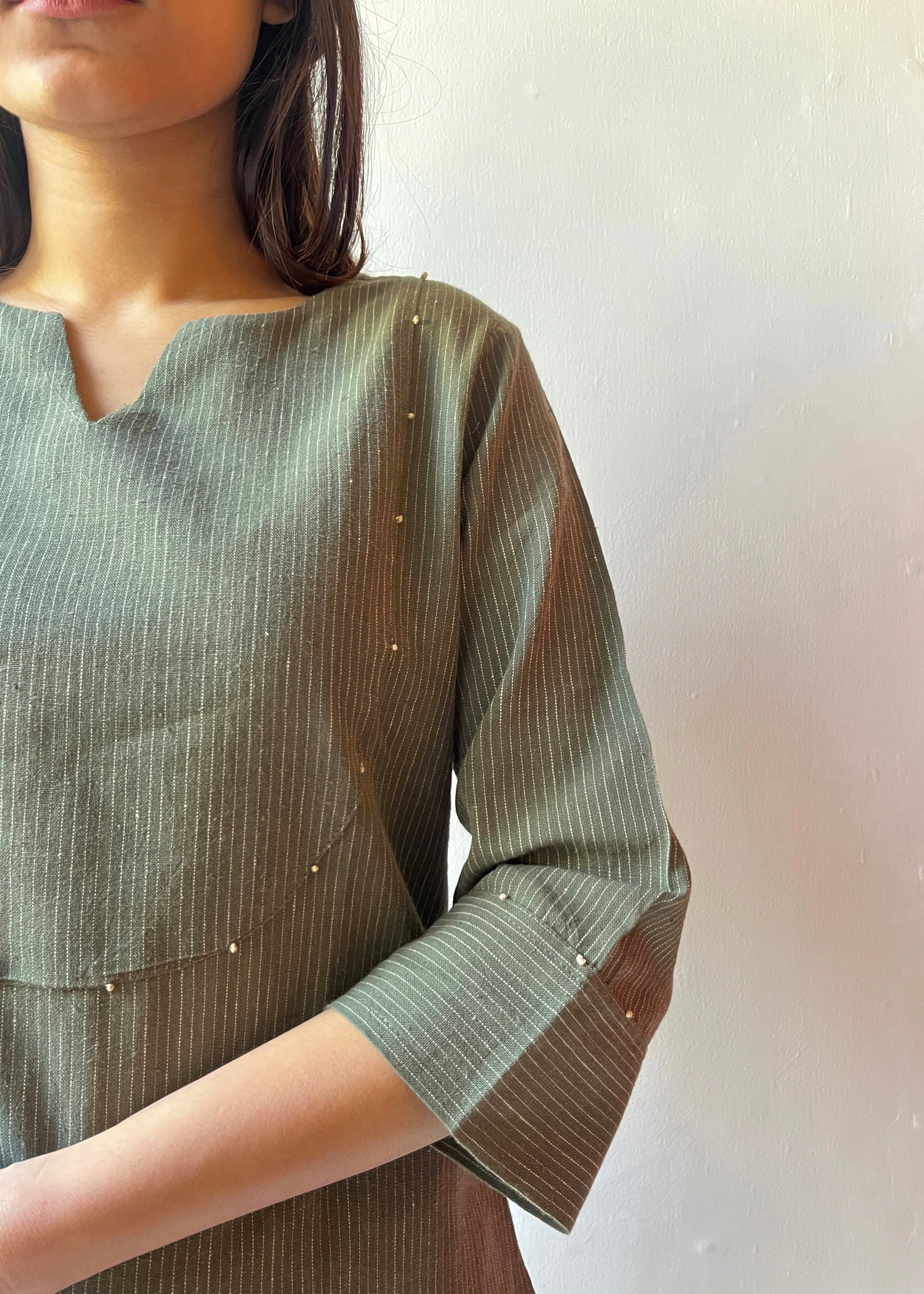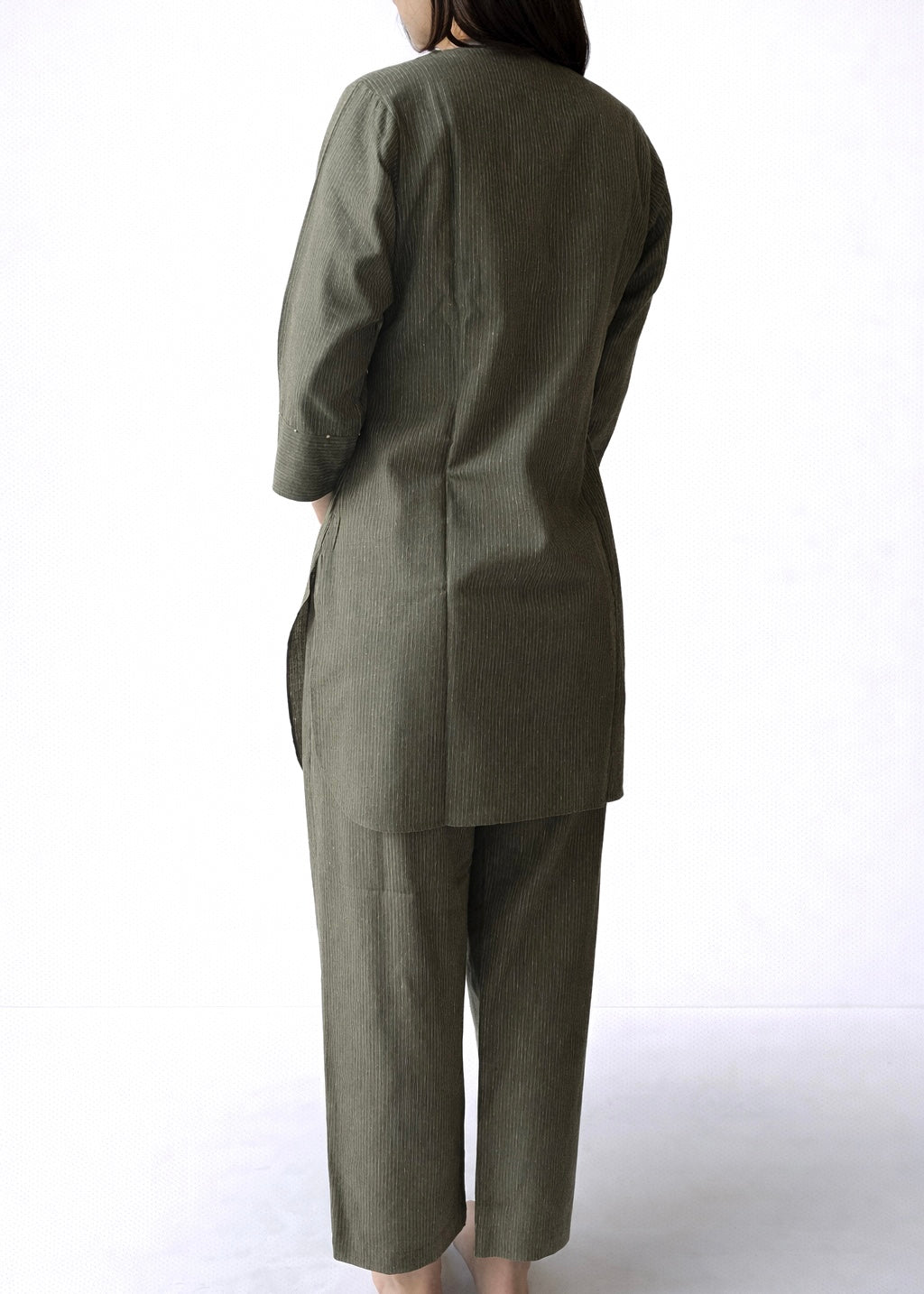 Long top paired with flat front pants, made using organic cotton handwoven fabric.